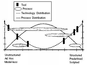 De um ponto de vista global este aspecto foi bem caracterizado pela National Software Foundation (NSF) num relatório de um workshop realizado em 1996. A Figura 1 ilustra as principais conclusões desse relatório. O eixo horizontal representa o espectro de aplicações, que vai desde ferramentas não estruturadas (lado esquerdo), até aplicações completamente estruturadas, ou que funcionam de forma algorítmica (lado direito). O eixo vertical representa quantidade. A linha a cheio corresponde às solicitações das organizações, enquanto que a linha a tracejado corresponde à oferta de aplicações.