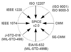 Na figura anterior podemos perceber as influências de um conjunto de standards que estiveram na base do SPICE. No entanto, a sua principal fonte de inspiração é a norma ISO 12207 - um standard internacional da ISO para os processos do ciclo de vida do software.